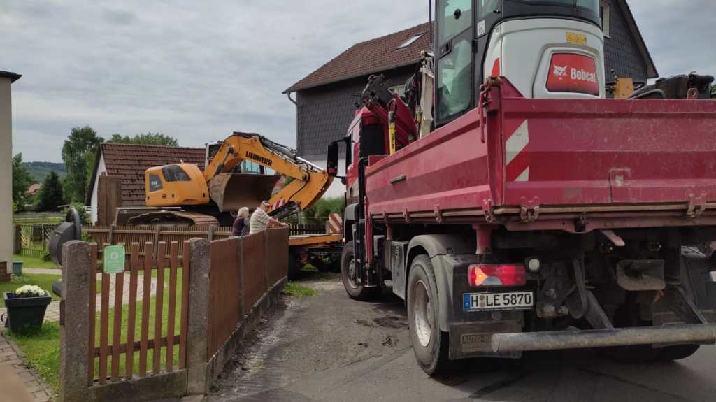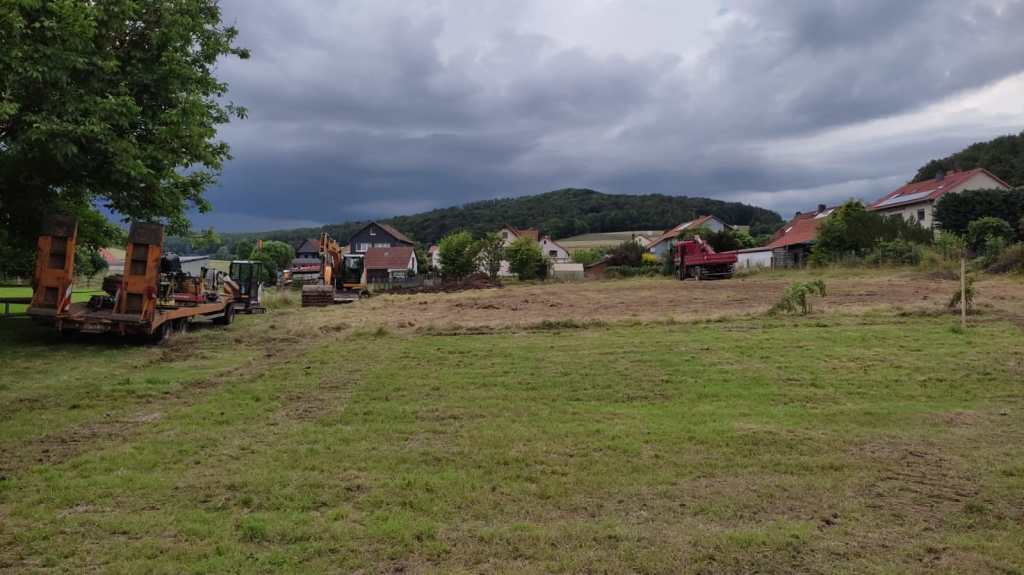 Am Vorabend haben wir noch das letzte Heu wegräumen können, jetzt rollt schon der Bagger, als wir am Nachmittag voller Spannung zum Grundstück kommen. Ein fröhliches Wiedersehen und einen ersten kurzen Briefing-Austausch später geht es auf der Baustelle weiter: Es ist zu unser aller großer Sorge für den nächsten Tag Starkregen angekündigt und die Bauzufahrt soll möglichst zu Beginn fertiggestellt werden, damit die LKW von oben in das Grundstück einfahren können und nicht über die enge Ortszufahrt kommen müssen. Nicht mehr und nicht weniger ist für die ersten Tage geplant…