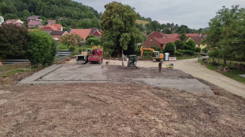 Der Vorher-Nachher-Blick im Vergleich von Montag und Freitag Mittag zeigt wohl am besten, was diese Woche geschafft wurde und wie die Baustelle Form annimmt. Kaum zu glauben, dass hier vor zwei Wochen noch eine grüne Wiese war…