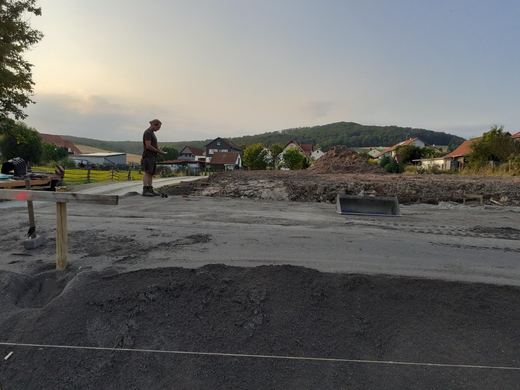 Seit Montag stand neben der Entwässerungsplanung (SW- / Regenwasser) die eigentliche Hausgründung im Fokus, die täglich weiter in die Höhe wuchs und langsam schon die Position und Höhe des Hauses erahnen ließ. Eine spannende Woche, denn auch die künftige Grundstücksgestaltung ließ sich täglich etwas mehr erahnen und damit auch, wie Grundstück und Haus sich in das Dorfbild einfügen.