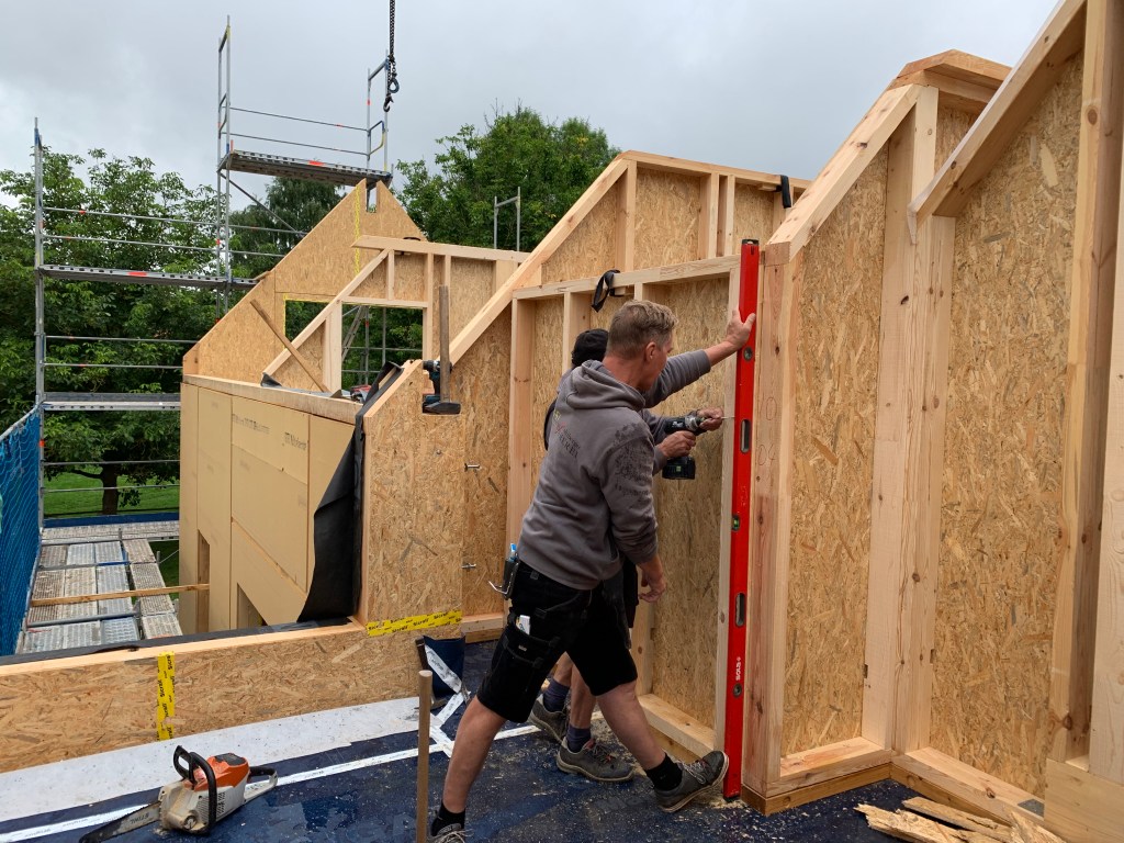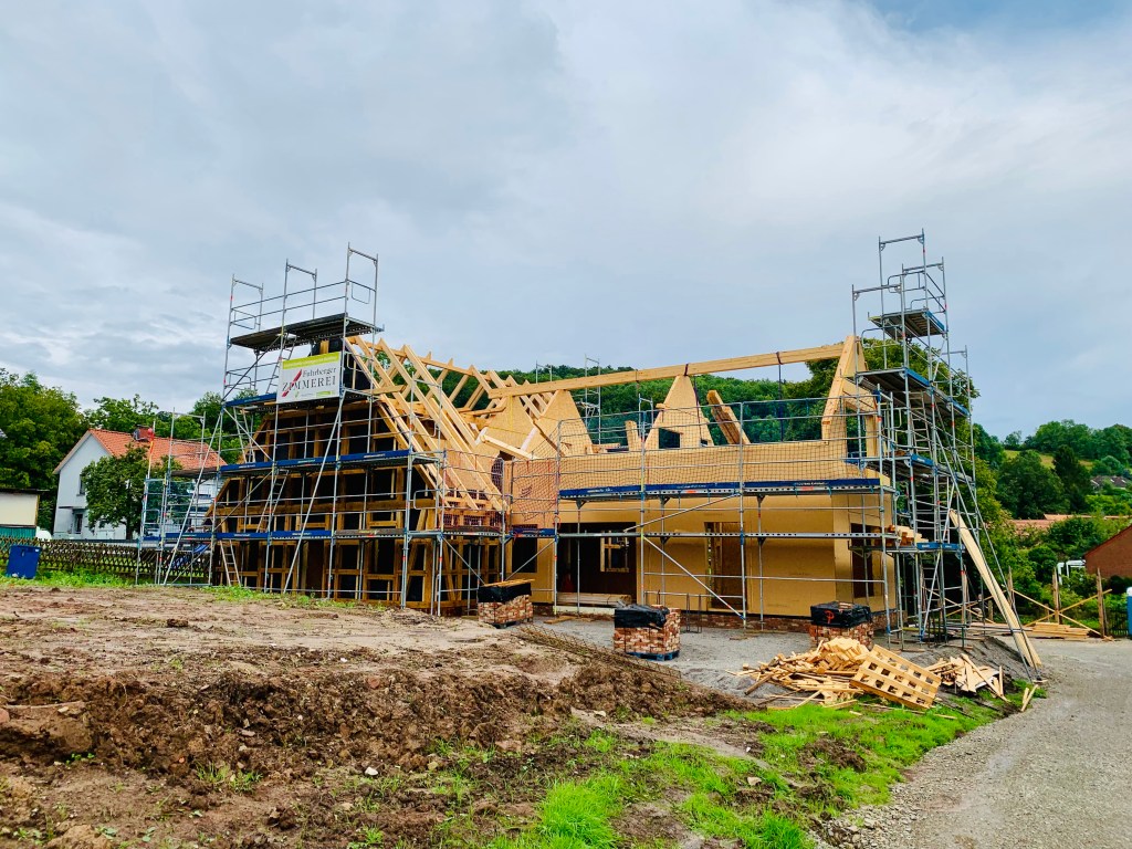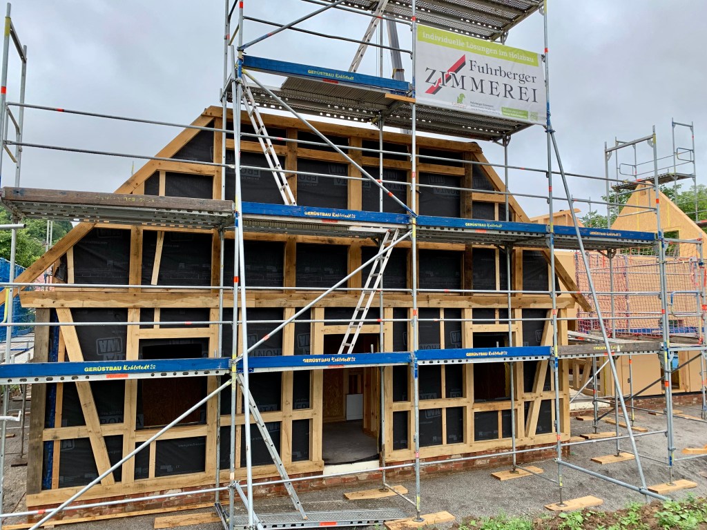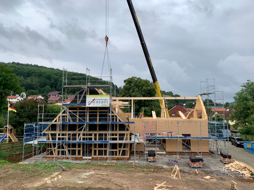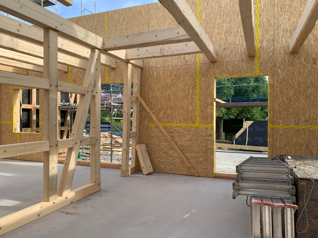 Diese Woche, erst Woche 6 nach dem Erdbaubeginn, stand ganz im Zeichen des Richtens von Erdgeschoss und Obergeschoss vom „Haupthaus“ und „Anbau“ unseres Fuhrberger Fachwerkhauses. Unser Fuhrberger-Team arbeitete mal wieder gefühlt rund um die Uhr, richtete die Holzrahmenwände im Anbau sowie die Innenwände des Fachwerk-Haupthauses, setzte die weitere Balkenlage im Erdgeschoss des Haupthauses und konnte uns dann ab Mittwoch erstmals unsere sichtbare Deckenbalkenlage im gesamten Erdgeschoss präsentieren. Sehr schön sehen die Deckenbalken mit der Fehlkante aus, ergänzt in den Hausecken um die sichtbare Außenbalkenlage aus Eichenholz.