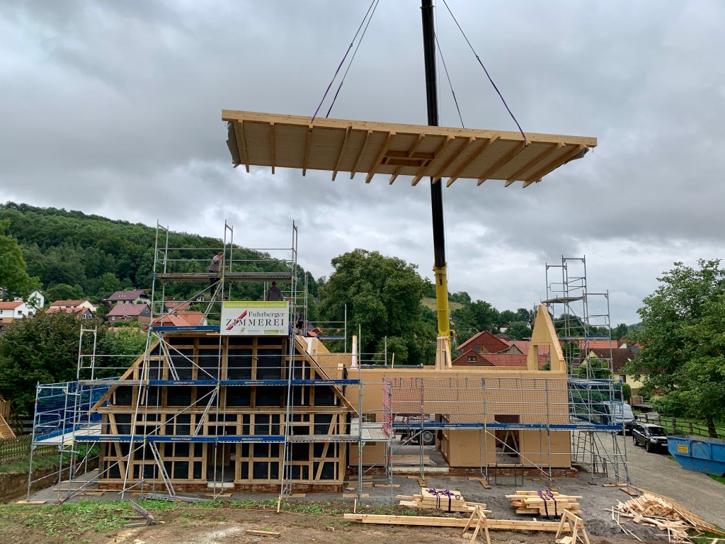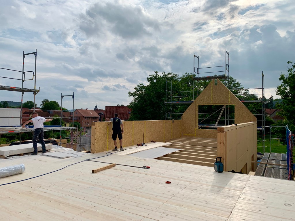 Am Donnerstag dann schließlich der große Termin, auf den wir schon gewartet hatten: Dachboden und Giebel werden eingebaut, die Deckenbalken waren direkt auf dem Grundstück mit der Stuhlschwelle zusammengefügt worden, zusätzlich bis Freitag dann die ersten Sparren und Kehlbalken zur Stabilisierung. In der kommenden Woche werden die restlichen Teile montiert, dann ist alles bereit für das Richtfest. Das ging jetzt wieder einmal sehr schnell – kommt man als Bauherren-Familie mal einen Tag nicht auf die Baustelle, hat man schon wieder etwas Wichtiges verpasst…