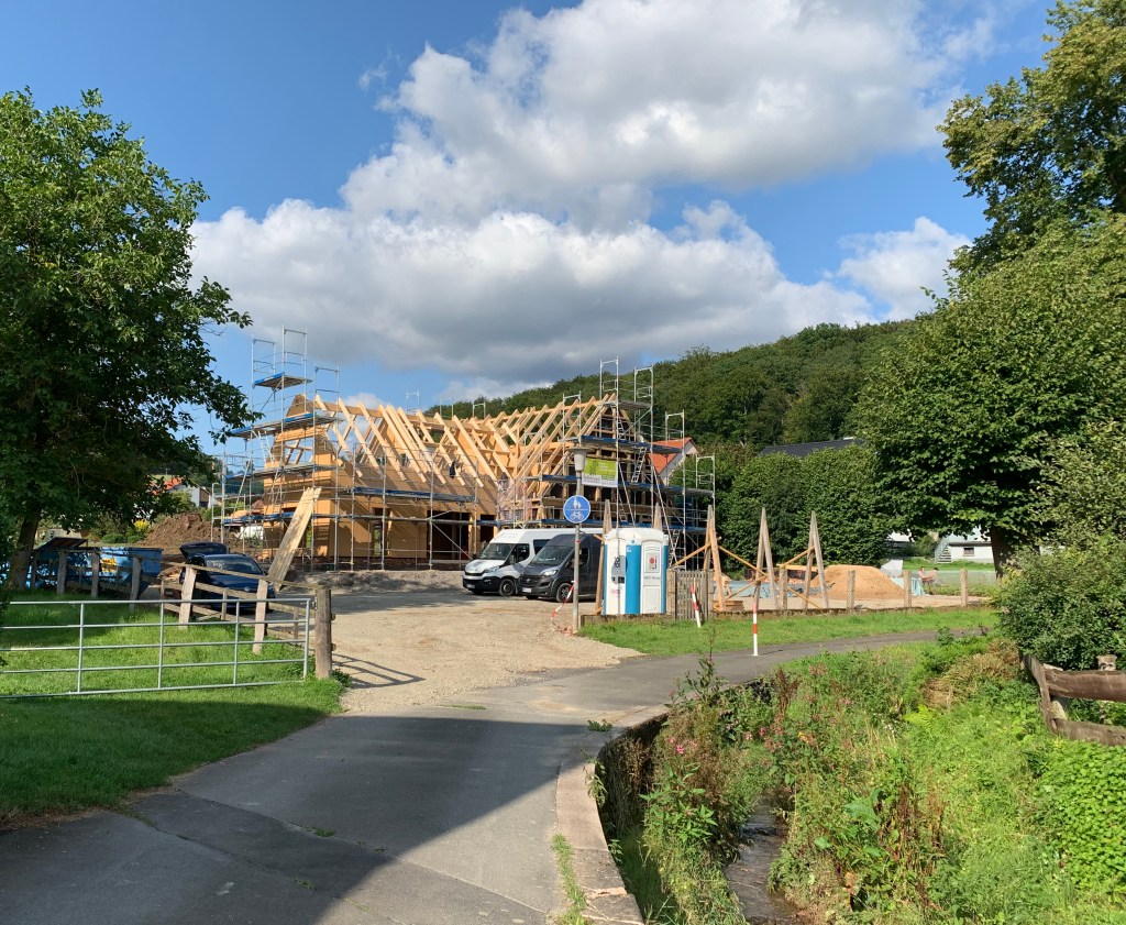 Ein Jahr später, viel Arbeit und Mühe später, aber auch viel Freude und Begeisterung später, sieht es ganz anders aus: Die am Bach entlang führende Straße, die künftige Einfahrt, das Fuhrberger Fachwerkhaus kurz vorm Richtfest.
