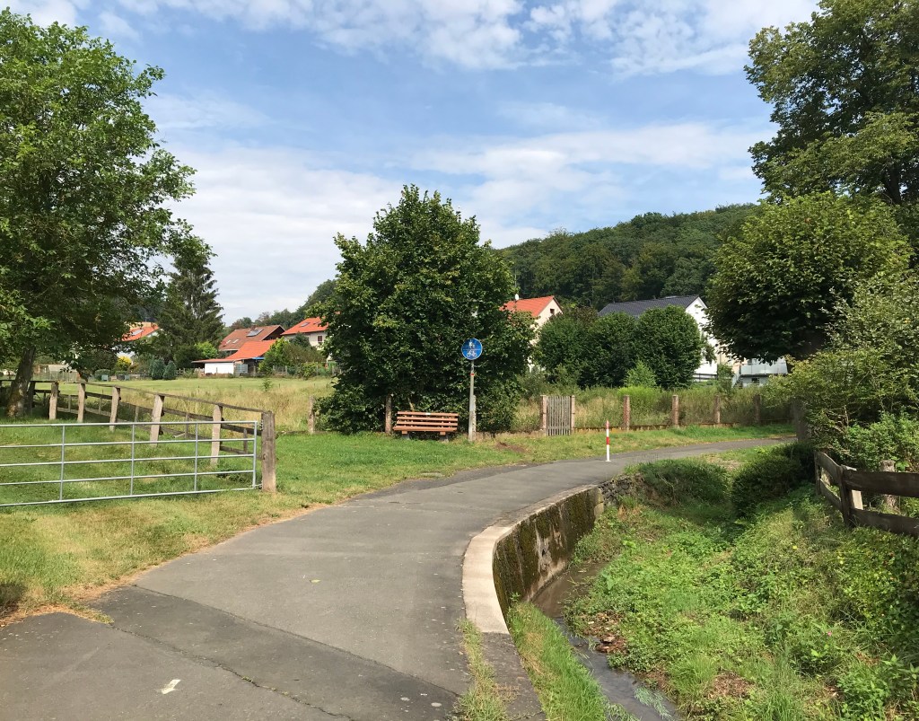Vor genau einem Jahr kamen wir das erste Mal auf das Grundstück und machten gleich auf dem Weg dorthin ein Foto: Die am Bach entlang führende Straße, die gemütliche Sitzbank mit dem Haselnussbaum dahinter, die großen und wilden Wiesen. Ein schöner Anblick und gewissermaßen Liebe auf den ersten Blick.