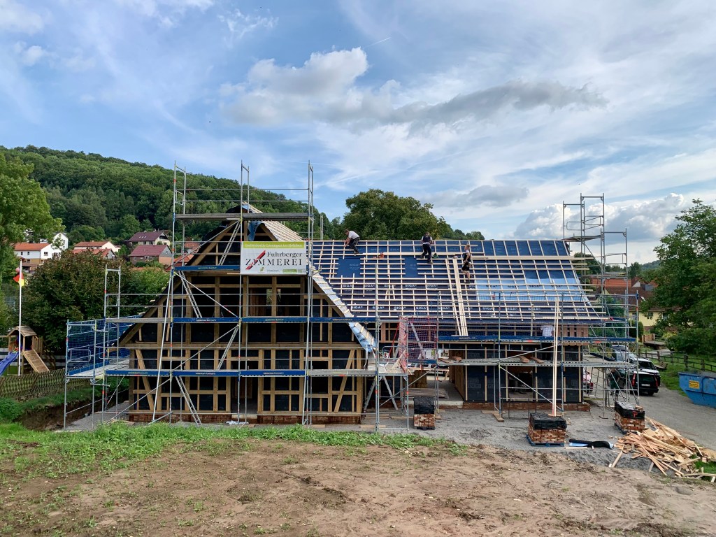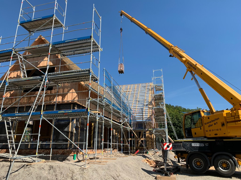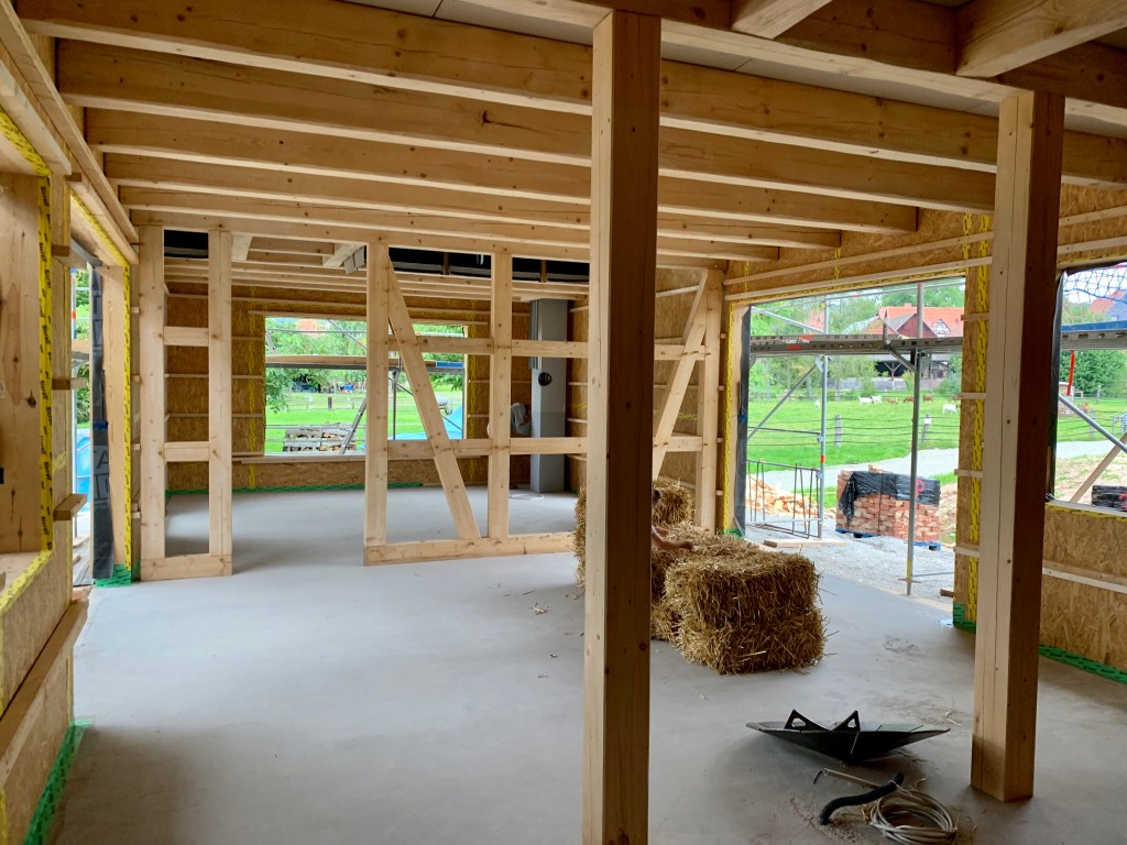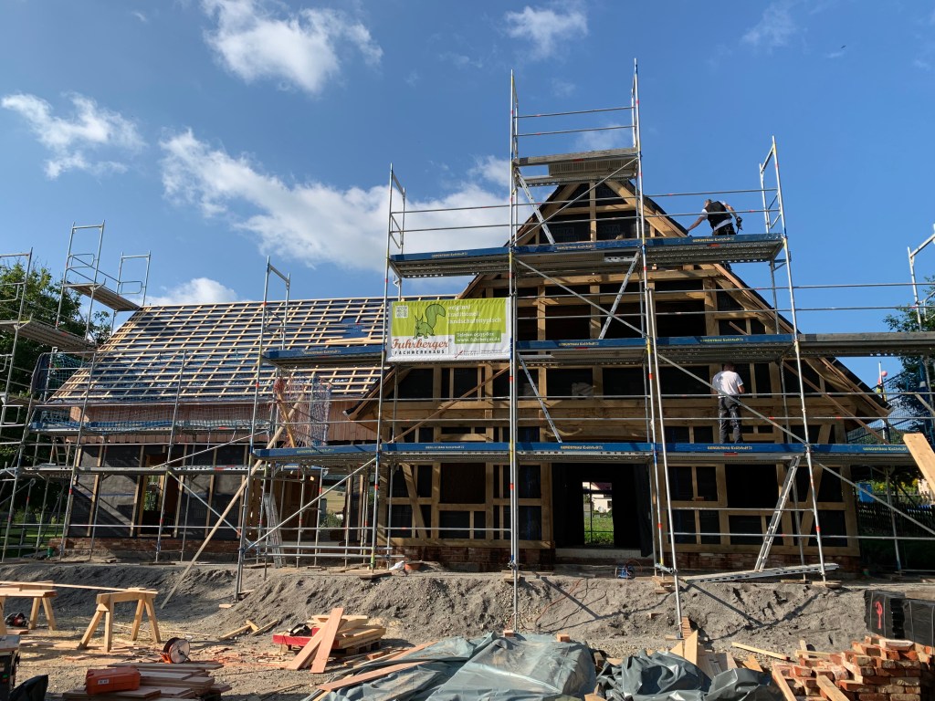 Es ist ja nicht so, dass es in den vorherigen Wochen nicht schon schnell gegangen wäre – aber auch jetzt nahm unser Fuhrberger Fachwerkhaus doch wieder erstaunlich schnell neue Formen an: Der Ausbau des Obergeschosses, das Fertigstellen des Dachstuhls, viele kleinere und größere Arbeiten und dann das Vorbereiten des Daches standen in den letzten beiden Wochen an.