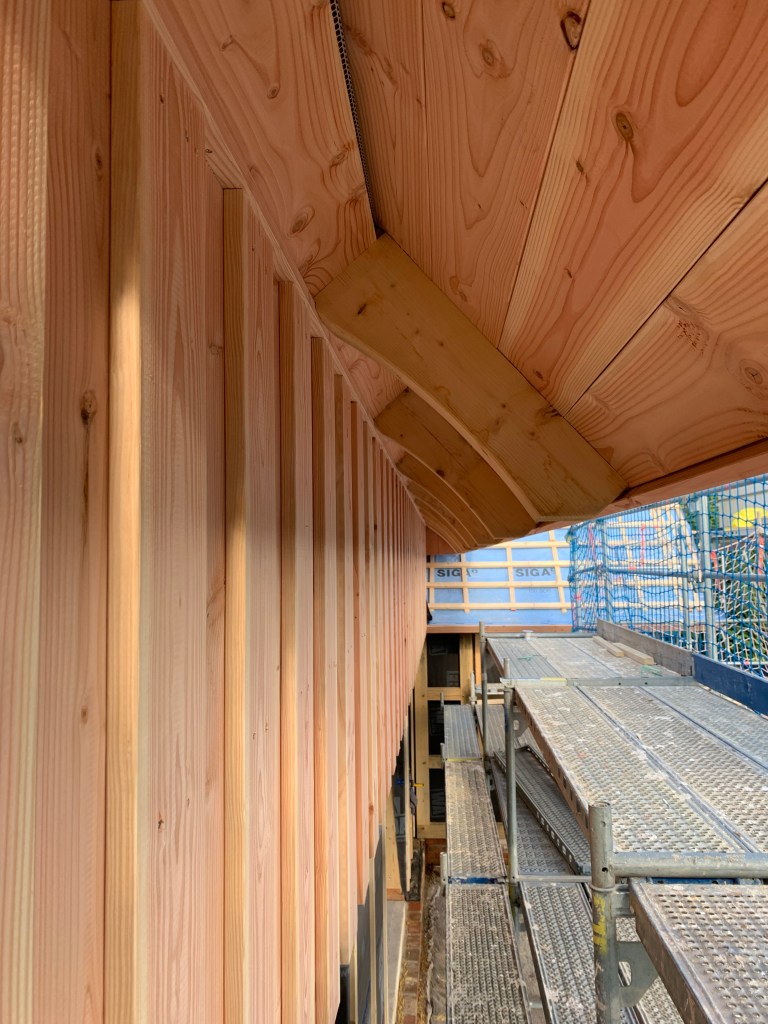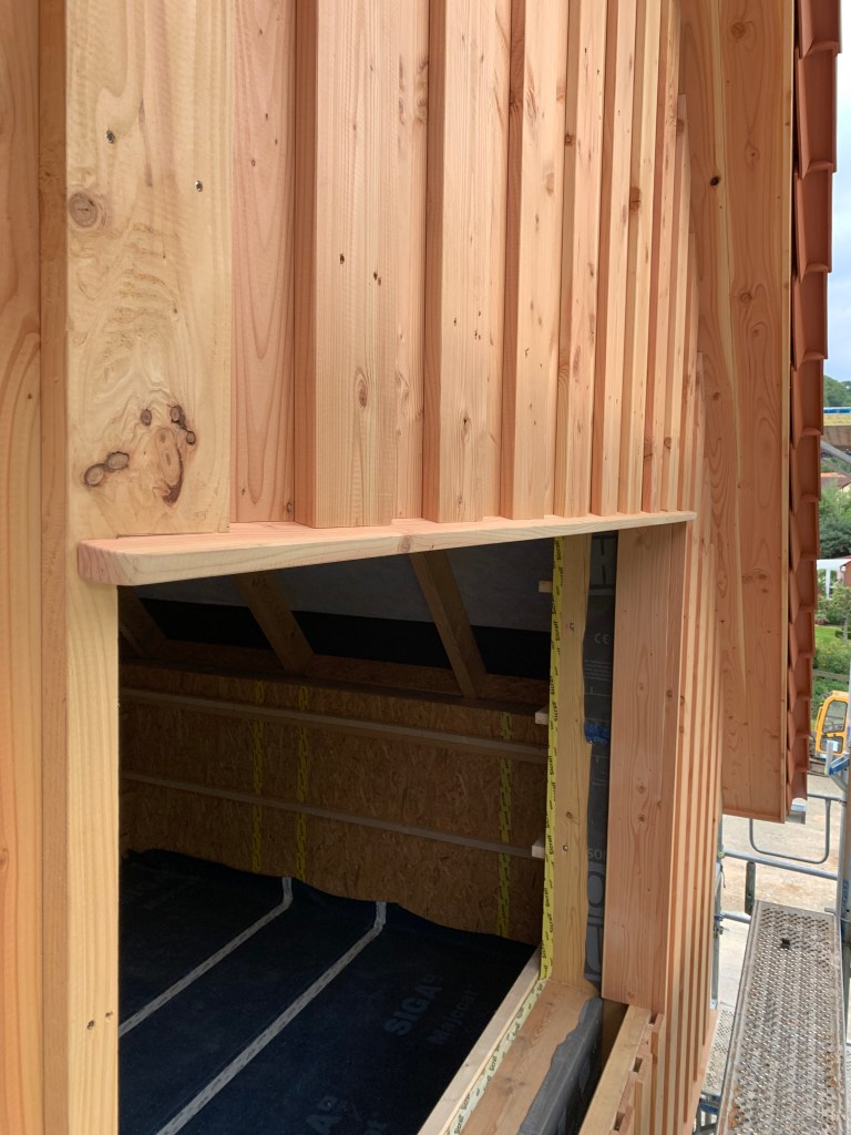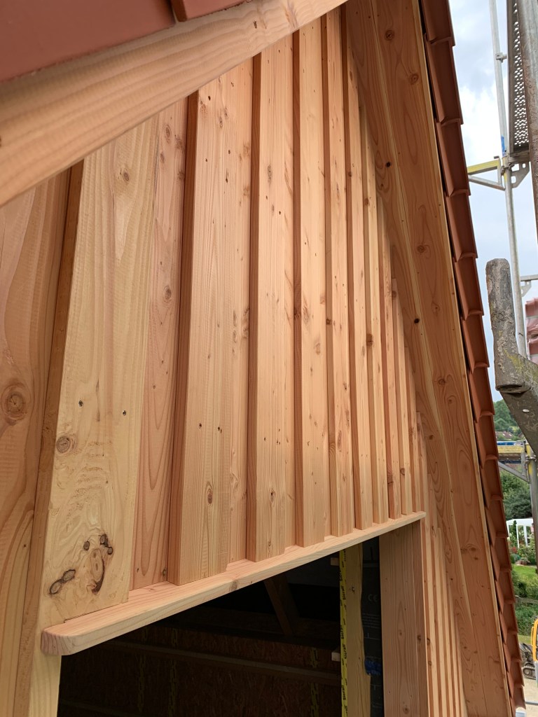Nach dieser Woche ist auch die Außenverschalung fertig, an der vor allem Jens, Sebastian und Jan gearbeitet haben. Es sieht einfach schön aus und ist handwerklich bis ins Detail gelungen. Für uns natürlich besonders schön, nachdem wir das Haus nur im 3D-Modell kannten und hofften, dass Holz, Stein und auch die Dachziegel miteinander harmonieren.