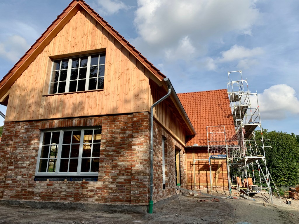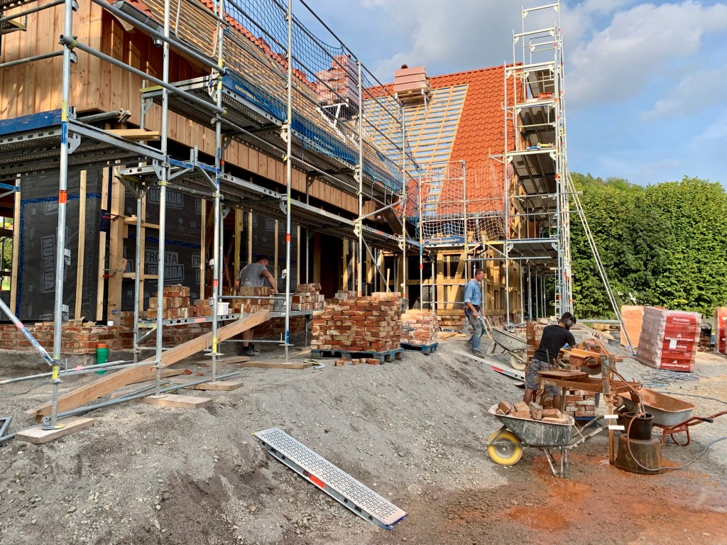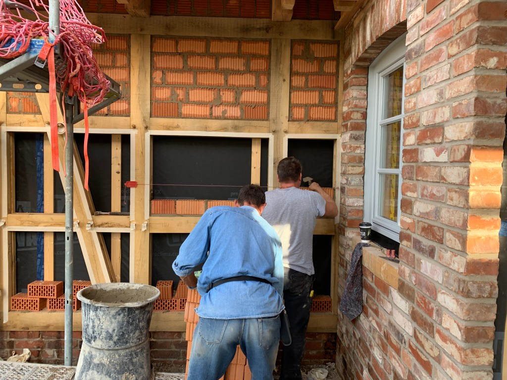 Der Anbau und das Haupthaus werden gemauert – Backsteinmauer und Hintermauerung der Gefache